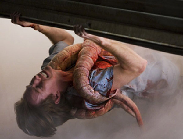 The movie stars Thomas Jane (‘The Punisher’, ‘The Sweetest Things’) and Marcia Gay Harden (‘Pollock’, ‘Mystic River’) and it’s about…surprise surprise, a mysterious mist that envelopes a small American town, bringing along with it some strange blood-sucking creatures. The story follows David Draymont (Jane), a poster artist whose house was partially destroyed one night by a storm. Leaving his wife behind, he goes to the town’s supermarket the next day with his son Billy (Nathan Gamble) and his neighbor Brent Norton (Andre Braugher). While in the supermarket, an old man with nose-bleed comes running helter-skelter inside, screaming that a mist is coming and that there’s something in it that took John Lee (we never know who John Lee is). Thus, everyone who was still in the supermarket, employees and customer alike, barricades the doors and pray to dear God that whatever is in that mist would not get inside.