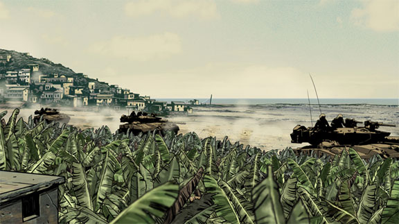 Before I go further, one has to say that the film is absolutely beautiful. Of course, this is somewhat obvious from the promotional material that has been drawn up thus far, and I almost couldn’t help but draw comparisons between ‘Waltz’ and ‘A Scanner Darkly’. While the comparisons may be made, and similarities could be found, there is little that the films share in common by way of process. Ari Folman basically shot the documentary first, and then created the animation later on (there’s an excellent article on it here). It is a painstaking process, one that took four years to complete; if nothing else, you can’t help but admire the man’s balls and tenacity in persisting with the project. The end result is a beautifully rendered project that is a delight to watch. While I was initially intrigued and fascinated by the process, eventually I realised how much the whole thing made sense. The animations provided for a smoother transitions between the scenes. Witness how he jumped from Israel to Holland with one of the first interviews he conducted with his friend. It was a very smooth transition, one that would not have been possible without the animation aspect of the film. It also helps to visual further the ideas being discussed; in one scene, one of his psychologist friends described how people often think what they want to think, that memory itself is unreliable, by way of an animation that shows how a person recalls their childhood.
