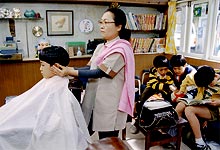But that’s jumping a little too far ahead. For now, let’s concentrate on this little gem of a film. ‘Yoshino’ is one of those films that is a little deceptive. It is indeed about a barbershop, but through that there is more than meets the eye. The story is set in Kaminoe, a place that is opened up on the film in a very musical way. It is a place that is very heavy on traditions, and one of the major ones is that every male in town must have the same bowl haircut. The place to get this haircut is Yoshino’s Barber Shop, run by Yoshiko (Masako Motai), a woman one associates with the strict school headmasters of yesteryears.