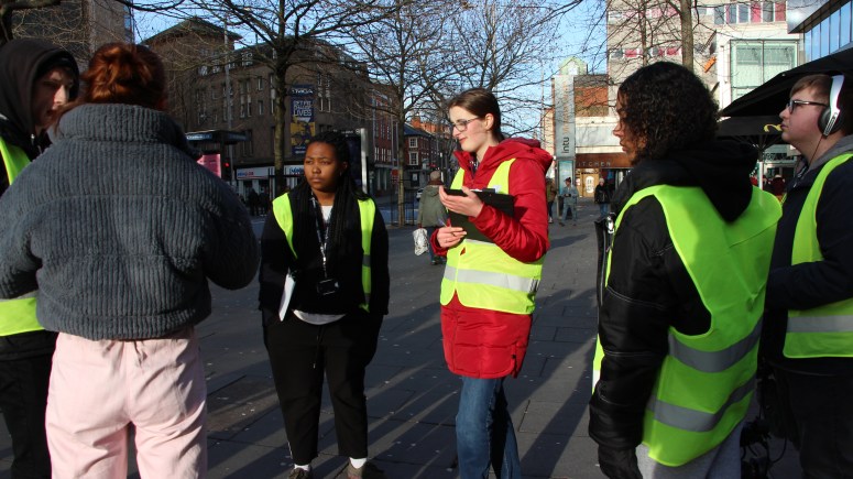 We had to wear yellow fluorescent jackets because we were filming in a busy city centre near heavy traffic. I think it was a safety precaution because we were also filming in early evening in low light.